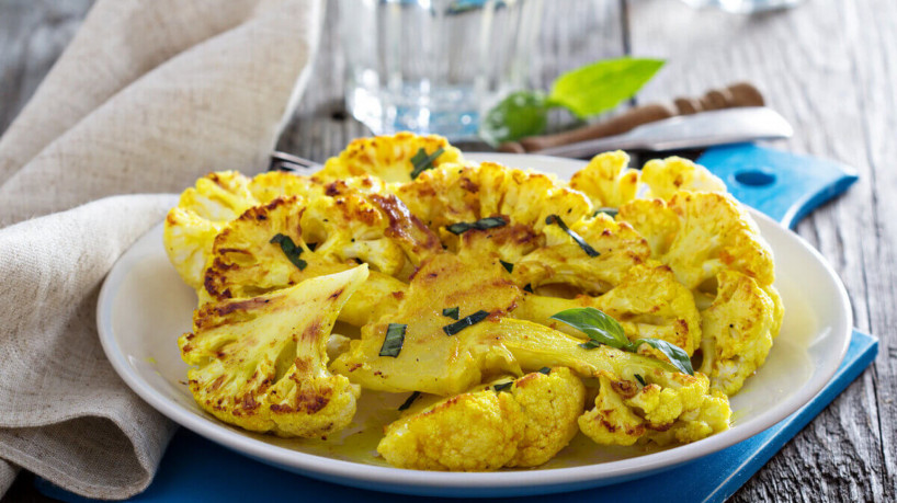 Em uma panela, coloque os floretes de couve-flor, cubra com água, coloque sal e tampe a panela. Leve ao fogo médio para cozinhar por 5 minutos, após levantar fervura. Enquanto isso, em um recipiente, coloque o alho, o suco de limão, o sal, a páprica, o açafrão e o azeite e misture bem. Reserve. Retire a couve-flor do fogo, descarte a água, espere amornar e passe os floretes sobre a mistura com açafrão. Após, disponha sobre uma assadeira untada com azeite e leve ao forno preaquecido a 240ºC até a superfície dourar. Sirva em seguida.