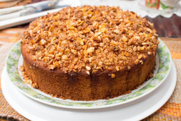 Em um recipiente, coloque o açúcar e o leite e misture bem. Após, despeje a mistura sobre o bolo, salpique com amendoim e sirva em seguida.
