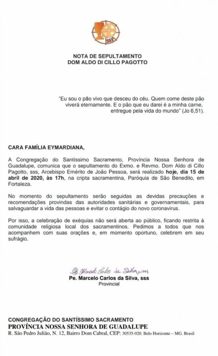 No entanto, a página oficial da Congregação do Santíssimo Sacramento informou que até a missa de corpo presente, com a presença apenas dos religiosos, foi cancelada por causa do risco de contaminação. “Acabamos de receber orientação dos médicos que não poderá haver celebração. Pedimos desculpas, mas precisamos cumprir as orientações (dos médicos)”.