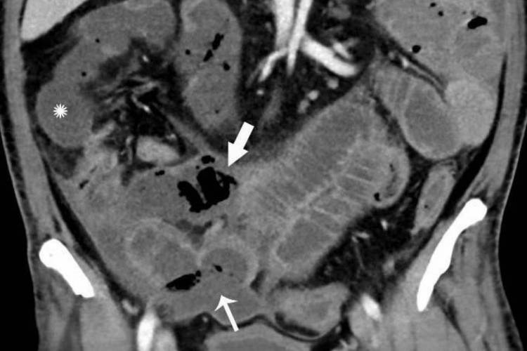 Foto 3: Homem de 54 anos demonstra pneumatose cistoide intestinal (setas) em um segmento longo do íleo. (Foto: Divulgação/Radiological Society of North America)