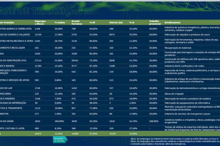 O Governo do Ceará anunciou na tarde desta quinta-feira, 28 de maio (28/05), o início gradual da reabertura da economia, a partir de 1º de junho (01/06). Na segunda começa a transição, com liberação de algumas atividades.