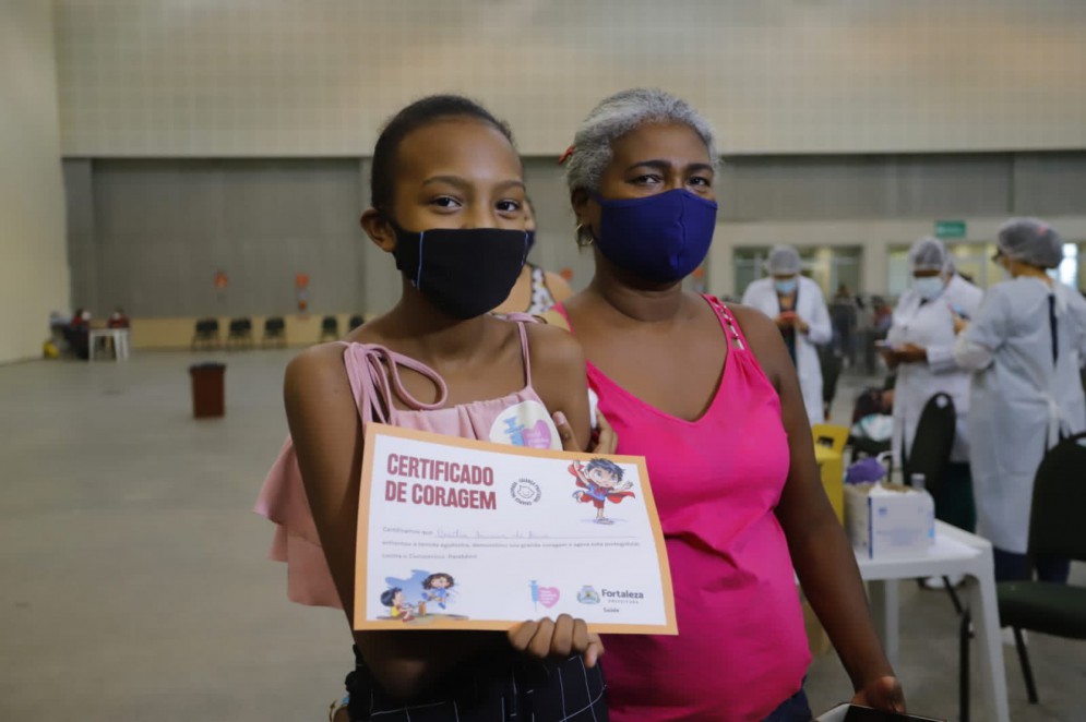 Com adesivo de vacinada e certificado em mãos, ela posou para foto publicada pelo governador Camilo Santana (PT) . Junto à Cecília, foram cadastradas 200 crianças para receber a primeira dose do imunizante pediátrico da Pfizer, em Fortaleza