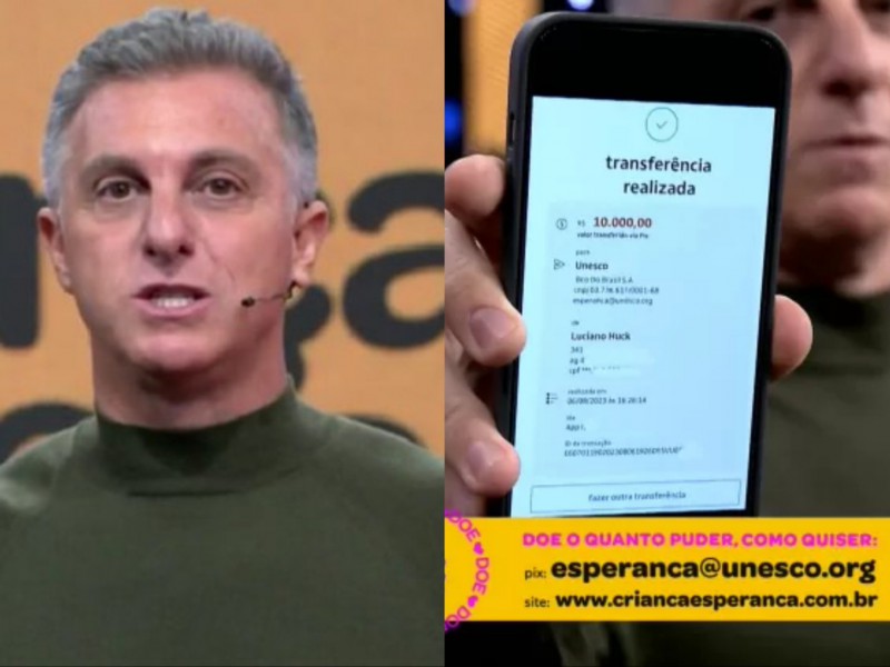 "Não adianta eu pedir dinheiro dos outros de doação, se eu não der exemplo. Eu fiz pelo pix, no meu nome, uma doação de R$ 10 mil. Está doado, em nome da minha família, R$ 10 mil para o 'Criança Esperança', portanto, me sinto com as credenciais para te pedir também", disse Huck, mostrando no celular o comprovante da doação.