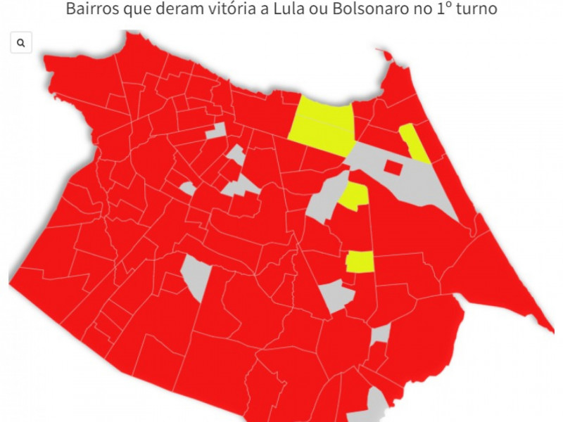 O segundo turno da eleição presidencial confirmou a divisão territorial dos votos em Fortaleza. Como ocorreu no primeiro turno, o presidente eleito Luiz Inácio Lula da Silva (PT) teve ampla hegemonia pela cidade. Foi o mais votado em 102 dos bairros considerados na divisão geográfica adotada pelo Tribunal Regional Eleitoral do Ceará (TRE-CE). Já o presidente Jair Bolsonaro (PL), derrotado na tentativa de reeleição, foi o mais votado em cinco bairros. Foram os mesmos cinco territórios onde ele já havia vencido no primeiro turno: Aldeota, De Lourdes, Guararapes, Meireles e Parque Manibura. Confira o mapa: