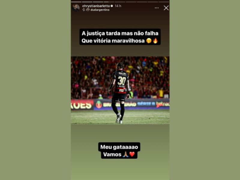 Ex-atacante do Ceará, Crystian Barletta repostou em suas redes sociais uma mensagem em tom de provocação ao Alvinegro de Porangabuçu após vitória do Sport, quando marcou um dos gols do time rubro-negro. Por meio dos stories do Instagram, o atleta do Leão da Ilha compartilhou uma mensagem com a frase: "A justiça tarda, mas não falha. Que vitória maravilhosa".