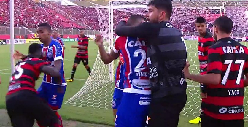 “Informo que aos quatro minutos do segundo tempo, após o gol de empate do Bahia, o Sr. Vincíus Góes Barbosa de Souza, nº 29, saiu para comemorar em frente à torcida do Vitória, provocando a mesma com gestos obscenos. Em seguida, o goleiro do Esporte Clube Vitória, o Sr. Fernando Miguel Kaufmann, nº 1, foi até o mesmo tirar satisfação e o segurou pela camisa. Nesse momento vários jogadores do Esporte Clube Vitória e do Esporte Clube Bahia foram também em direção ao jogador Vinícius, do Bahia, dando início a um conflito generalizado, incluindo jogadores do banco de reserva de ambas as equipes”, escreveu o árbitro, antes de citar os atletas expulsos.
