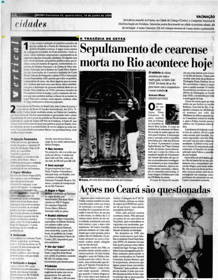 No dia 14 de junho de 2000, a capa do O POVO estampava em letras garrafais a chamada “SOS Segurança”. Noticiava a intenção da família de processar o governo carioca, a demissão do comandante da PM, coronel Sérgio da Cruz, pelo então governador do Rio Anthony Garotinho e também o enterro de Geísa no cemitério do Bom Jardim. Na ocasião, cerca de três mil pessoas compareceram para prestar homenagens à professora de artesanato.