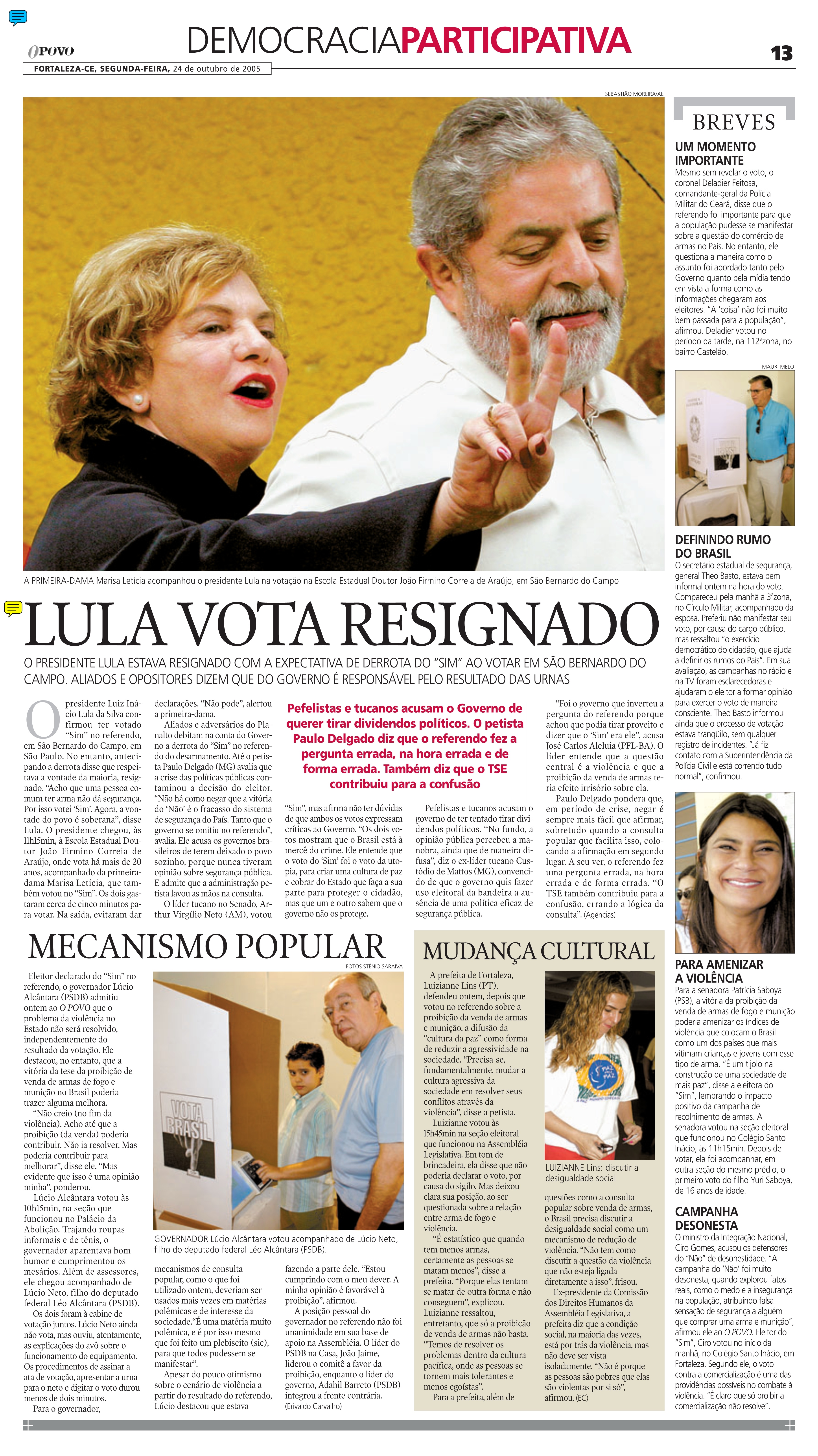 Na mesma página, o então governador do Ceará, Lúcio Alcântara, é destacado votando com o neto. Alcântara, do PSDB, era eleitor declarado do sim, a favor da proibição do comércio de armas e munição no País. A prefeita de Fortaleza, Luizianne Lins, também compareceu às urnas pelo sim, assim como a então senadora pelo Ceará Patrícia Saboya.
