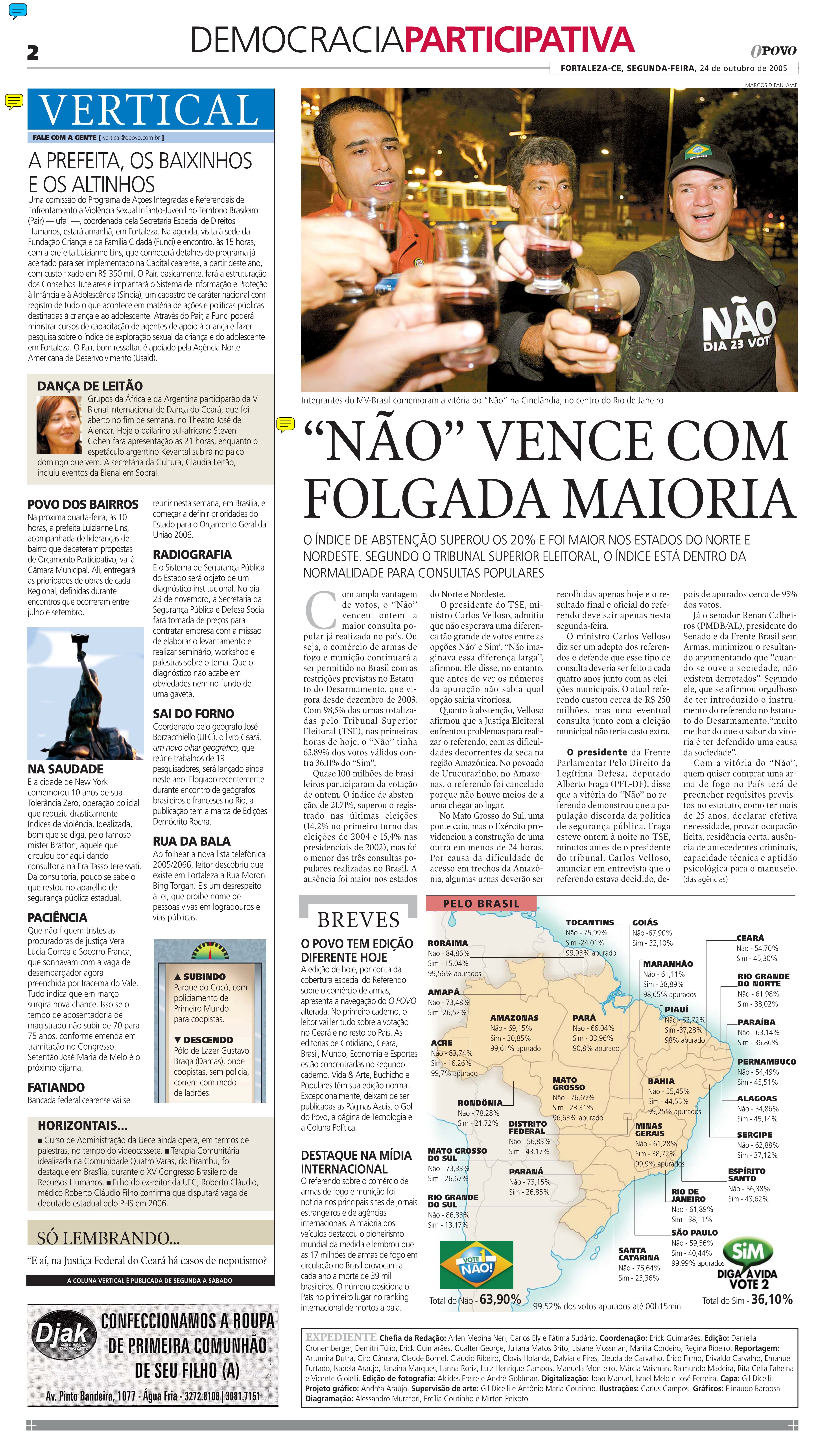 No 24 de outubro, dia seguinte à realização do referendo, O POVO trouxe o resultado na capa e todo o conteúdo acerca da votação em um caderno especial de 14 páginas, chamado Democracia Participativa. A cobertura abrangia o processo consultivo em Fortaleza, Sobral, cidades como Uruburetama, além do Cariri.