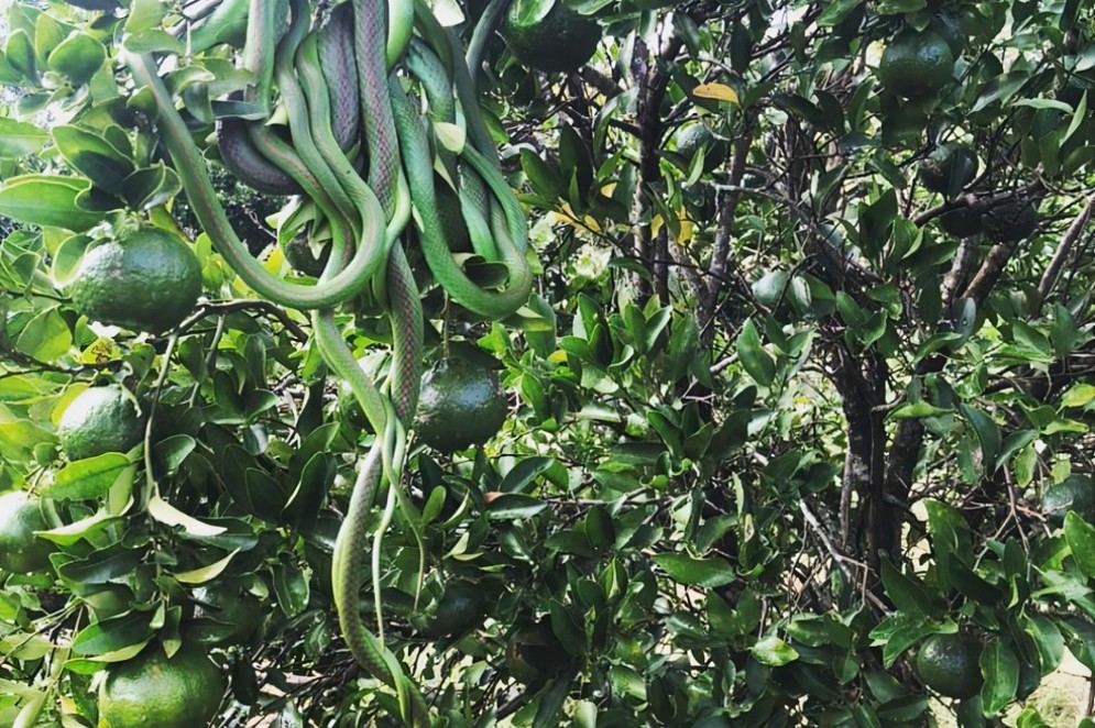 Um morador do município de Santo Antônio da Patrulha, interior do Rio Grande do Sul, foi surpreendido por um fenômeno da natureza. Em abril do ano passado, Telmo Santos se deparou com um "cacho" de cobras-verde penduradas sob os galhos de um pé de tangerina.