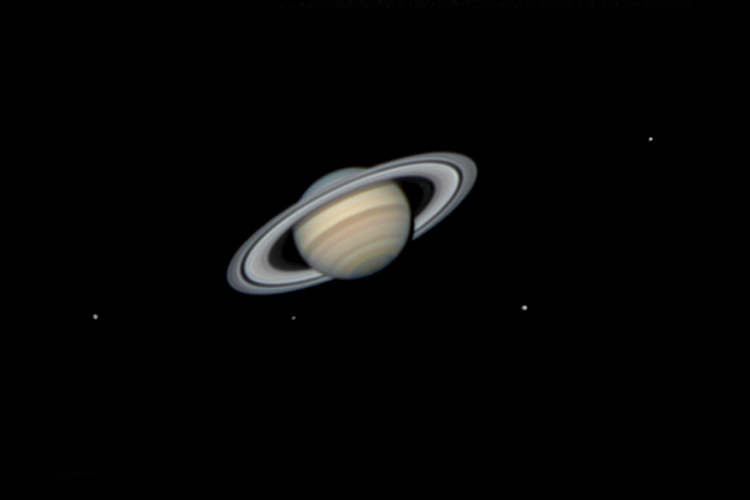 ‘’Esta foto selecionada foi quase que acidental. Porque aqui em Maceió, em agosto de 2021, choveu durante os 20 primeiros dias. Como sou persistente, no 21º dia tentei novamente fazer o registro do quintal de casa, mesmo sem céu limpo. Quando apontei para Saturno, ele estava apresentando uma baixa turbulência atmosférica, o que o deixou nítido. Quando eu resolvi fotografar, decidi registrar também as luas, ampliei um pouco o campo e aumentei o brilho. Foi então que vi que as luas estavam fazendo uma configuração em forma de arco, o que contribuiu muito para o aspecto harmonioso da imagem.’’, lembra.