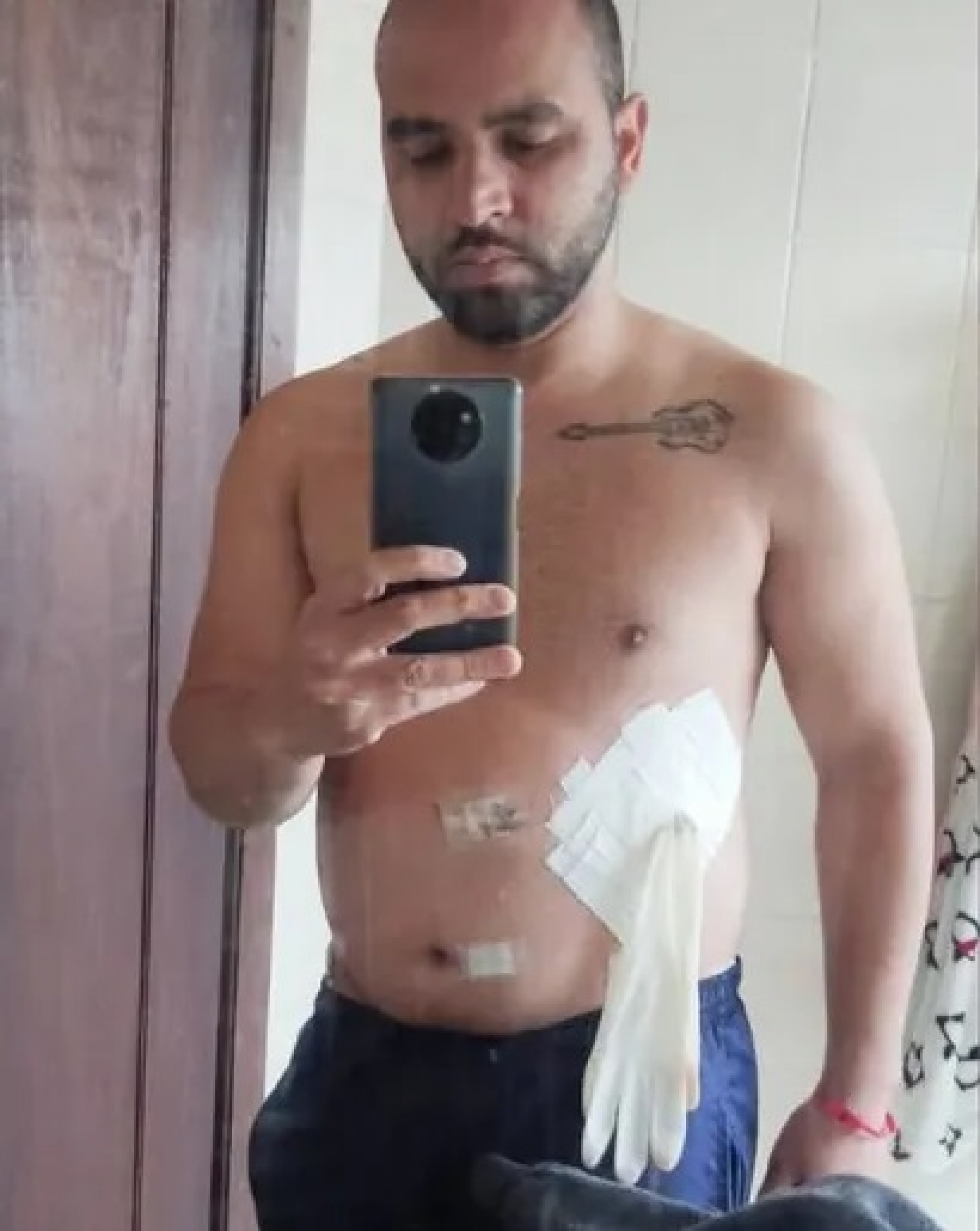 “O médico falou que era medicina de guerra e colocou uma luva improvisando o procedimento. Saí do hospital com aquela luva pendurada na barriga, vazando muito. Em casa eu não tinha controle. Fiquei encharcado de secreção... Minhas roupas e cobertores ficaram todos molhados”.