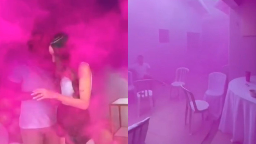 Na gravação, é possível escutar risos e brincadeiras enquanto os convidados correm da fumaça rosa, sem feridos.