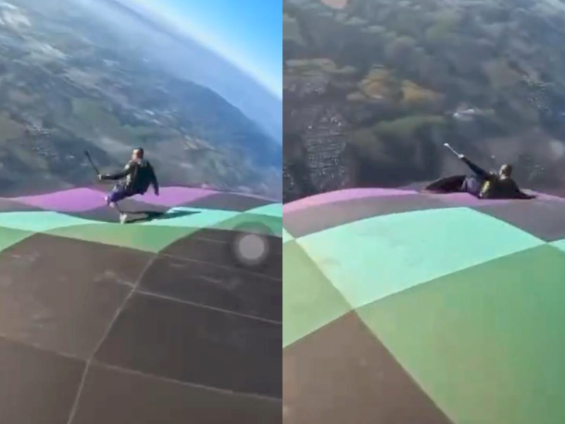 Em vídeo divulgado nas redes sociais do atleta, é possível ver o momento em que ele se prepara para saltar de cima do balão, mas enquanto caminha para realizar o salto o tecido se rasga.