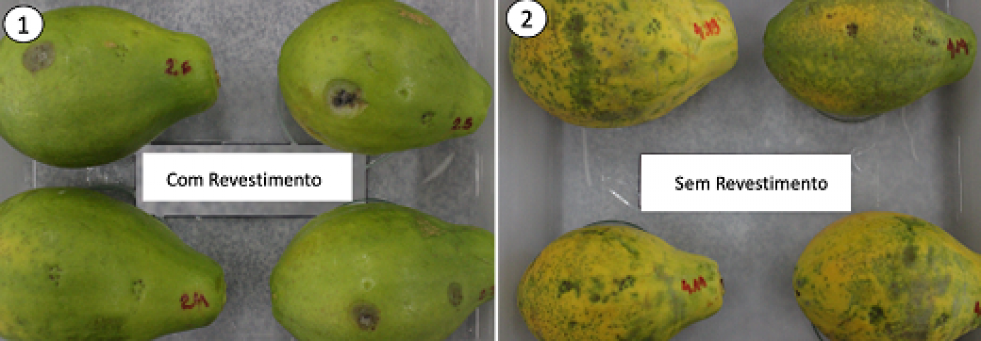 As frutas usadas estavam em estado 2 de maturação, quando a fruta está com apenas 25% da superfície amarelada. Todos foram higienizados, imersos no revestimento, secados e acondicionados em caixas plásticas e armazenados à temperatura de 12º C. Os resultados indicaram que, com o revestimento, houve aumento de até 10 dias no tempo de vida útil do alimento. O mamão sem revestimento, por outro lado, mudou sua coloração em 13 dias. Já o mamão revestido chegou no mesmo estágio em 23 dias.