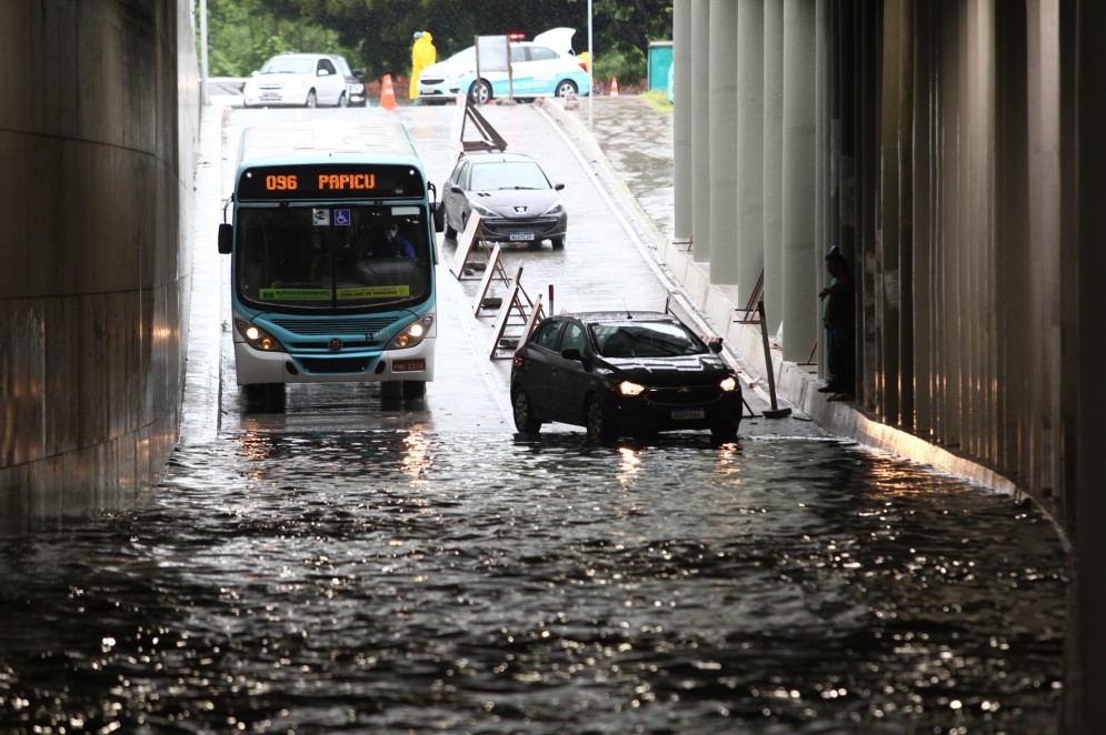 A forte chuva na Cidade fez com que o túnel da avenida Alberto Sá fosse bloqueado no sentido Aldeota por conta de alagamento. No sentido Papicu, apenas veículos grandes podiam trafegar durante a manhã de terça. No bairro Vila Velha, uma árvore caiu na avenida Mozart Pinheiro de Lucena, entre as ruas Tapajós e Rio Parnaíba. O sentido sul-norte da via precisou ser bloqueado.