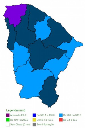 Já em números absolutos, o melhor resultado de março foi de Coreaú. Segundo os dados da Funceme, no mês, foi observada uma precipitação de 408,5 milímetros. A região costuma ser a mais chuvosa de março, com precipitação de em média 295,6 mm em março. (Colaborou André Bloc)