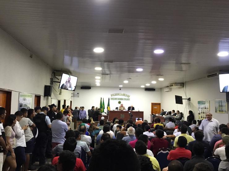 Como aconteceu na sessão da quinta-feira, 6, a população se aglomerou na área externa da Câmara para acompanhar a votação, que foi transmitida por um telão.