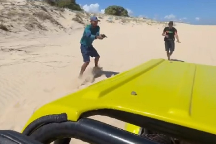 O motorista do buggy que foi abordado por homens armados durante passeio na praia do Cumbuco, no município de Caucaia, contou, nesta quarta-feira, 10, que os turistas, inicialmente, não tiveram noção da situação e pensaram que abordagem era “encenação”.