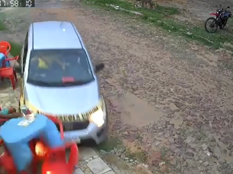 As imagens mostram o carro se aproximando da calçada e acelerando até colidir com a mesa onde o homem estava. O veículo passou a poucos centímetros, mas não o atingiu.