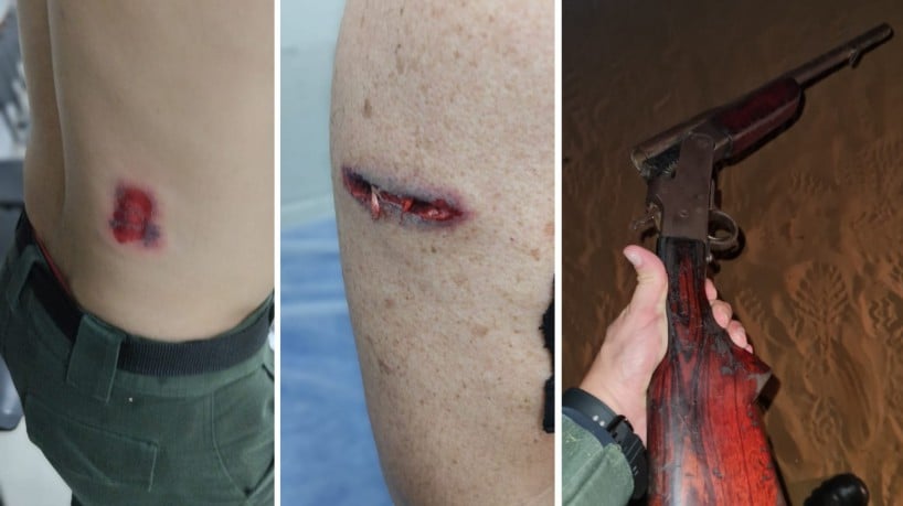 Agentes foram atingidos no braço e nas costas, mas estão fora de perigo; suspeito foi preso em flagrante e carabina artesanal usada no crime, apreendida