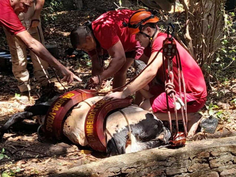Animal caiu na cacimba e precisou ser removido com sistema de multiplicador de força; bovino foi devolvido ao proprietário sem lesões aparentes