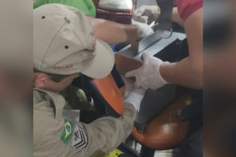 Os bombeiros foram acionados e, ao chegarem ao local, encontraram a vítima com sangramento intenso e fortes dores.
