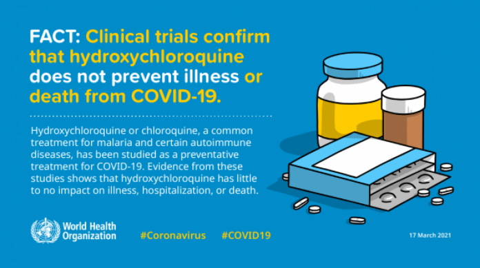 A OMS interrompeu os ensaios clínicos com hidroxicloroquina como tratamento para covid-19 após o Solidariedade, um estudo do grupo colaborativo Recovery, do Reino Unido, e uma revisão da Cochrane evidenciarem que a hidroxicloroquina não reduziu as mortes entre pacientes com covid-19 hospitalizados.