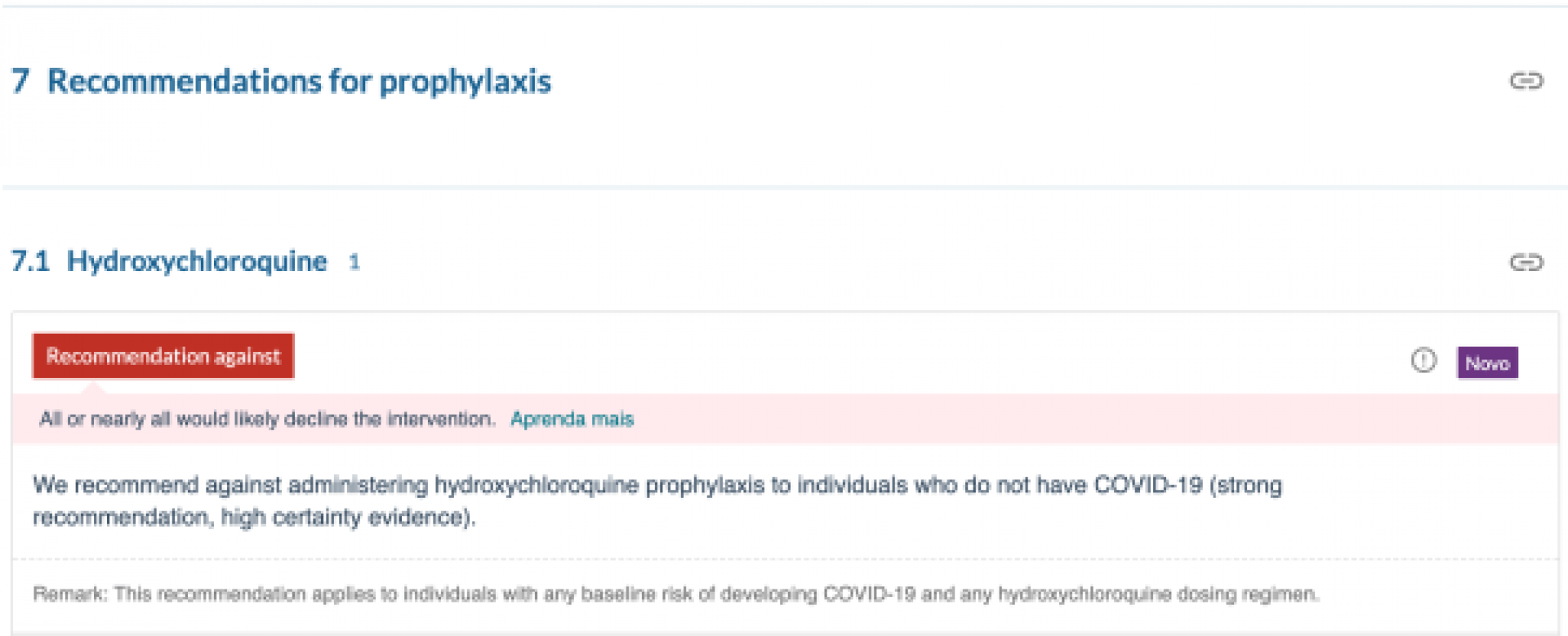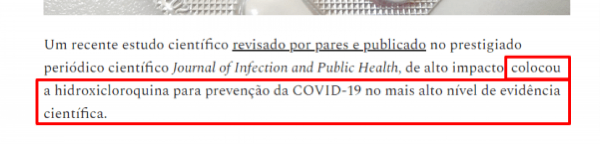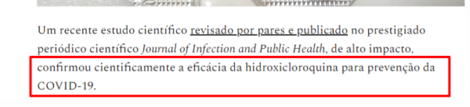 Posteriormente, o texto foi alterado para: “Um recente estudo científico revisado por pares e publicado no prestigiado periódico científico Journal of Infection and Public Health, de alto impacto, colocou a hidroxicloroquina para prevenção da COVID-19 no mais alto nível de evidência científica.”