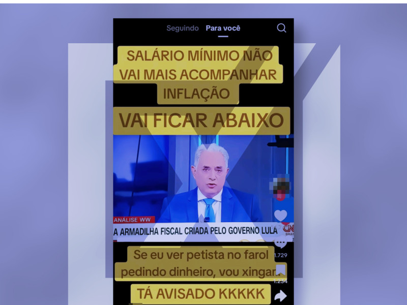 Conteúdo analisado: Publicação usa trecho em áudio do programa de William Waack, na CNN Brasil, no qual o jornalista faz uma análise sobre o que considera uma “armadilha fiscal” criada pelo governo Lula (PT) para um homem alegar que o governo brasileiro não tem dinheiro porque gasta demais. No post, ele aplica legendas com as frases: “Salário mínimo não vai acompanhar inflação”, “Vai ficar abaixo” e “Se eu ver petista no farol pedindo dinheiro, vou xingar… tá avisado”.