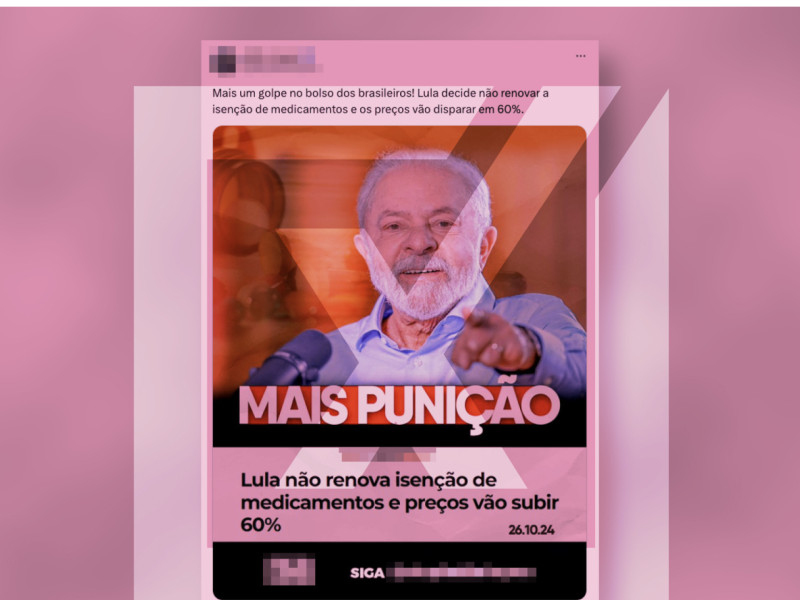 Conteúdo investigado: Imagem publicada por um deputado federal diz que o presidente Lula não renovou a isenção de impostos sobre medicamentos e que os preços vão subir 60%. O autor do post escreve: “Mais um golpe no bolso dos brasileiros!”.