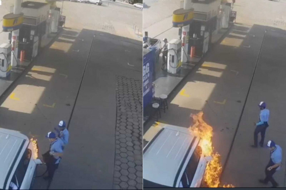Nas imagens registradas pelas câmeras de segurança do estabelecimento, é possível ver o exato momento em que o profissional acende um isqueiro próximo à entrada do tanque de um carro branco em que abastecia e, logo em seguida, chamas se espalham pela mangueira e também por parte do veículo.
