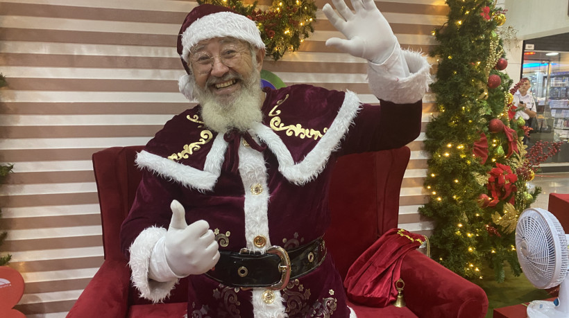 Um ventilador pequeno refresca Roberto Albano Coelho, 59, ao se posicionar para contar a sua história no sofá vermelho. Como um famoso que retorna à porta de seu hotel, ele já encontra três jovens em uniforme escolar, pedindo uma foto com o Papai Noel (valeu até selfie!).