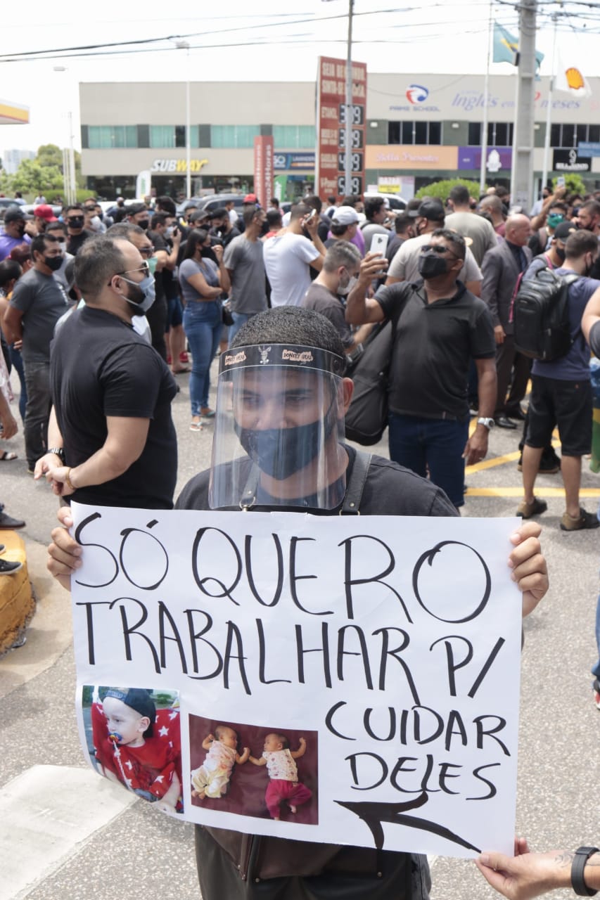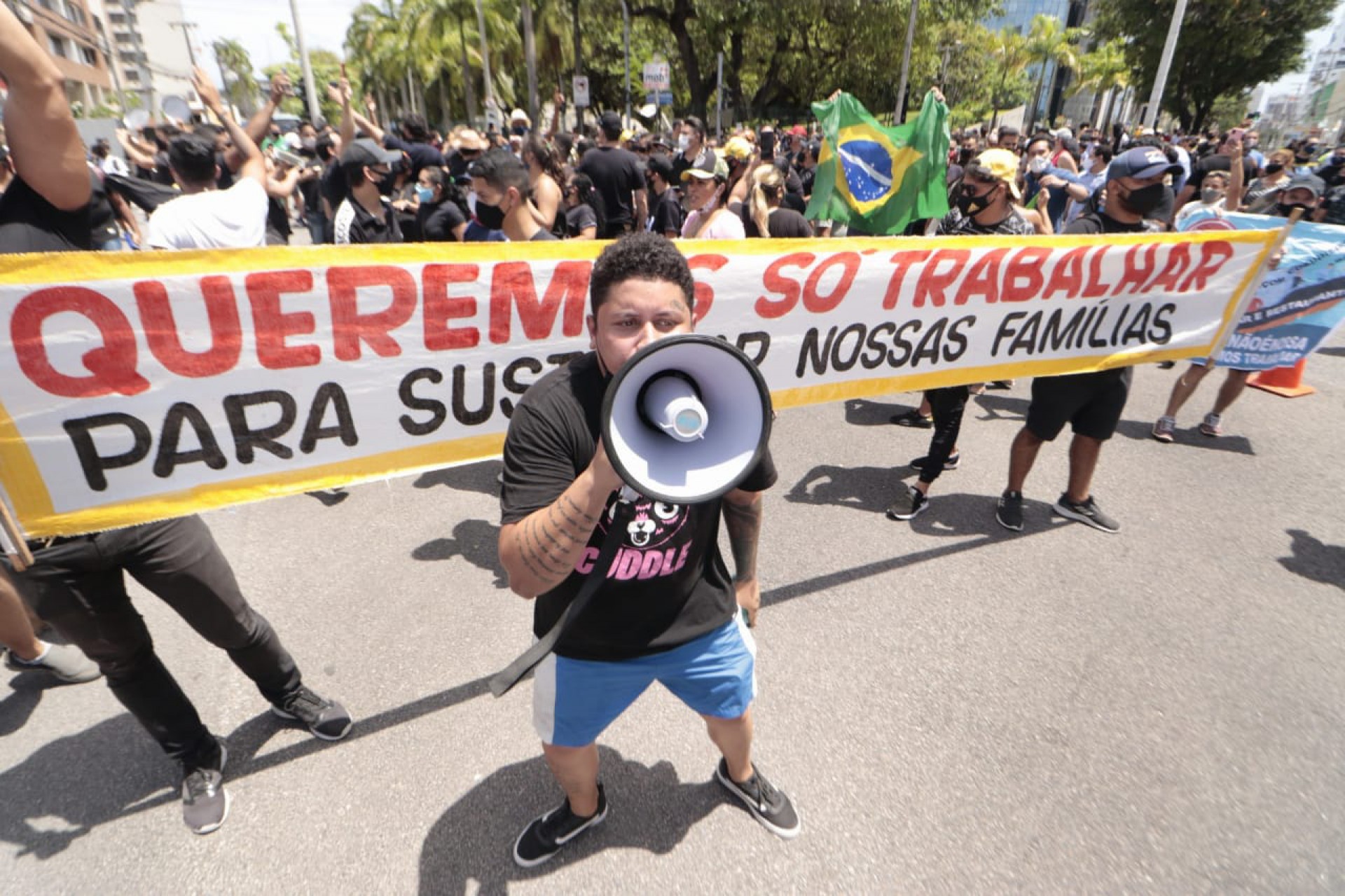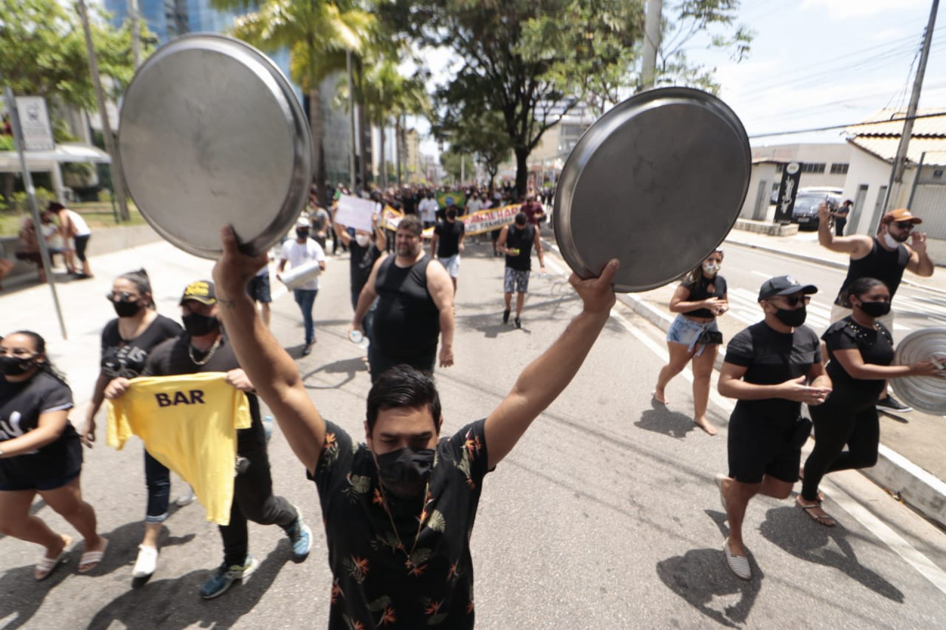 Um dia após o novo decreto de isolamento social entrar em vigor em Fortaleza, integrantes do setor de alimentação realizam protesto em frente à Assembleia Legislativa do Ceará contra a medida que reduziu os horários de funcionamento de bares, restaurantes e barracas de praia na Capital. A medida foi tomada diante do aumento expressivo de casos de Covid-19. O protesto conta com forte articulação da Associação Brasileira de Bares e Restaurantes do Ceará (Abrasel-CE).