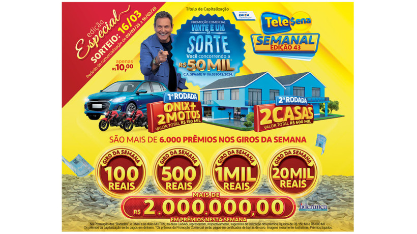 Tele Sena Semanal: 43º sorteio hoje (16/03/25); mais de R$ 2 milhões em prêmios