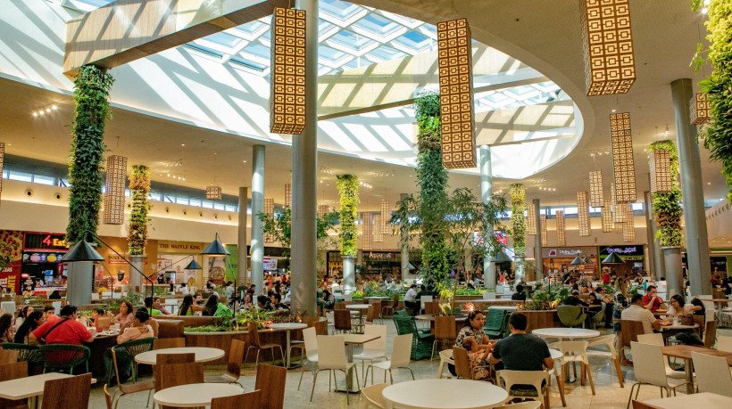 - PROJETO paisagístico sustentável, inspirado no conceito da biofilia, nos espaços de convivência, como a praça de alimentação da última expansão.