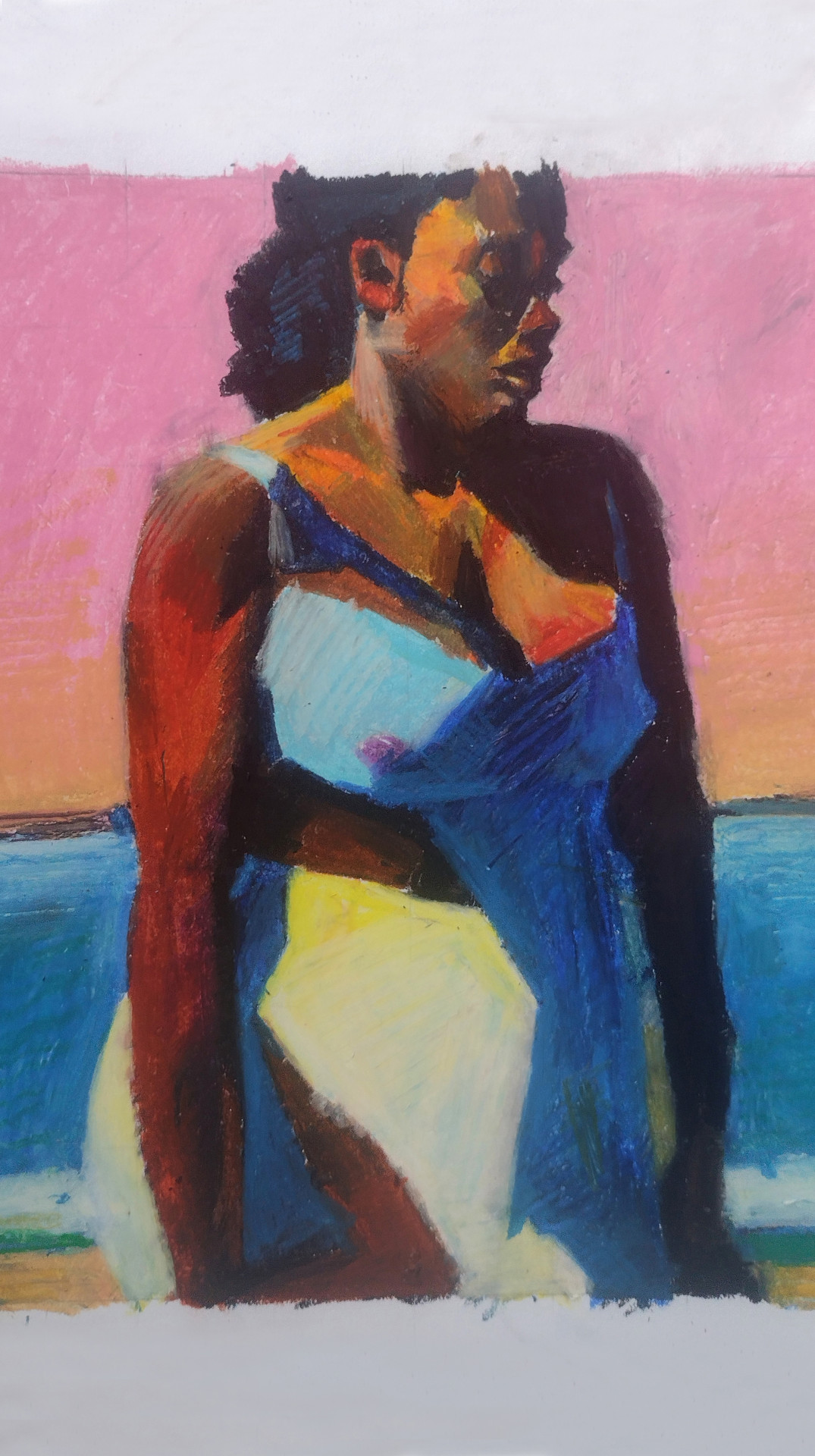 Com o passar dos anos foi sempre praticando e me aprimorando, focado em se tornar ilustrador e concept artist para a indústria do entretenimento, onde geralmente se trabalha no computador com mesa digitalizadora. Foi somente durante a pandemia que descobriu que a pintura a óleo e o desenho tradicional são o que lhe movem dentro das artes visuais. Atualmente busca pontos de encontro entre toda essa bagagem de um desenho mais estilizado de quando focava em ilustração, o estudo do trabalho de pintores do passado e contemporâneos, sua vivência enquanto homem negro em Fortaleza e as possibilidades que o digital pode oferecer. A obra A Forma da luz é pintura em Pastel Oleoso sobre Papel.