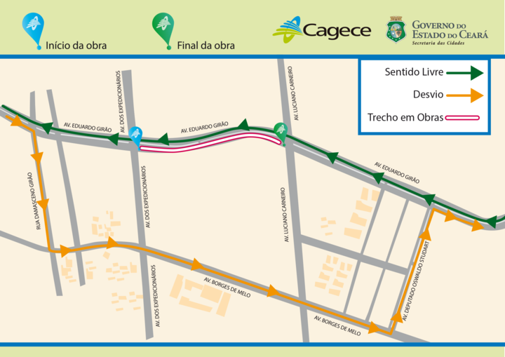 Para tanto, a avenida Eduardo Girão será interditada no sentido João Pessoa-Aguanambi, entre as avenidas dos Expedicionários e Luciano Carneiro. Durante a execução da obra, o tráfego de veículos será desviado com apoio da Autarquia Municipal de Trânsito e Cidadania (AMC).