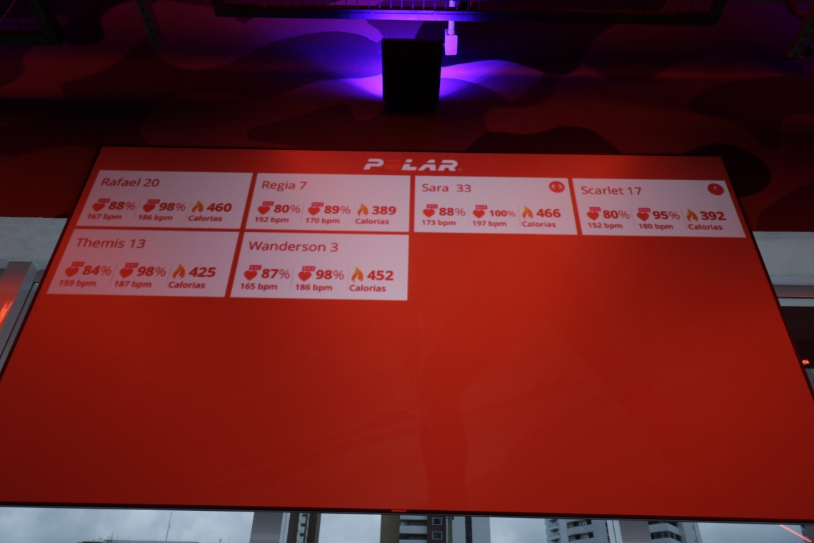 Depois dos 45 minutos de bootcamp, o rendimento de cada participante é exibido em telão, que aponta desde o aluno que mais perdeu calorias ao que manteve o ritmo elevado por mais tempo.