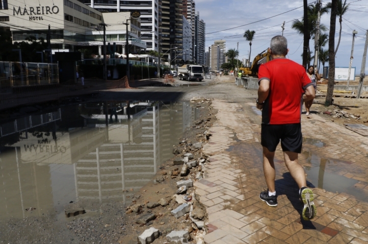 Os trabalhos de requalificação da avenida Beira Mar uniram-se aos transtornos das chuvas desta manhã. Poças de água acumularam-se em torno de alguns trechos da obra, atrapalhando a passagem de alguns pedestres e o dia a dia de alguns funcionários das barracas de praia.
