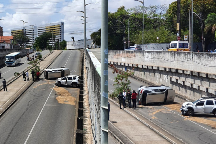 Colisão de veículos causa capotamento e interdita viaduto em Fortaleza