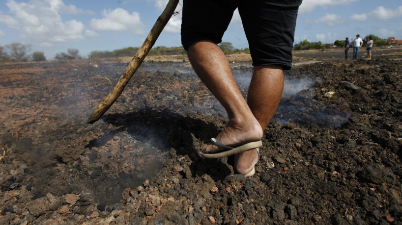 De acordo com a bióloga da Sema, o material que está no território é composto por dejetos de tratamento que não tiveram a limpeza por parte da Cagece. “Quando você retira a parte preta, o solo está vermelho, de piçarra. A água da antiga estação de tratamento secou e ficou daquele jeito, não teve a devida raspagem.”