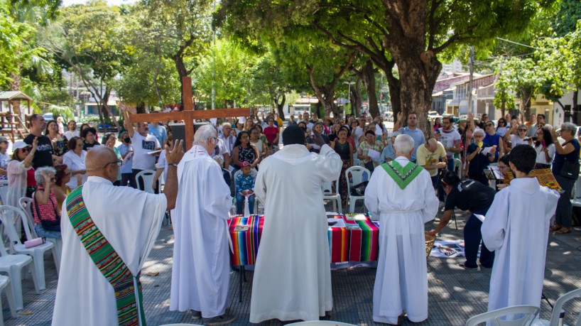 Dezenas de pessoas se reuniram na manhã deste domingo, 20, para manter viva a memória de vítimas da violência letal no Ceará. Entre cantos e ofertórios, a Praça João Gentil, no bairro Gentilândia, em Fortaleza, recebeu uma missa ecumênica do Movimento Igreja em Saída, que reúne organizações católicas do Estado voltadas para ações e debates sociais.