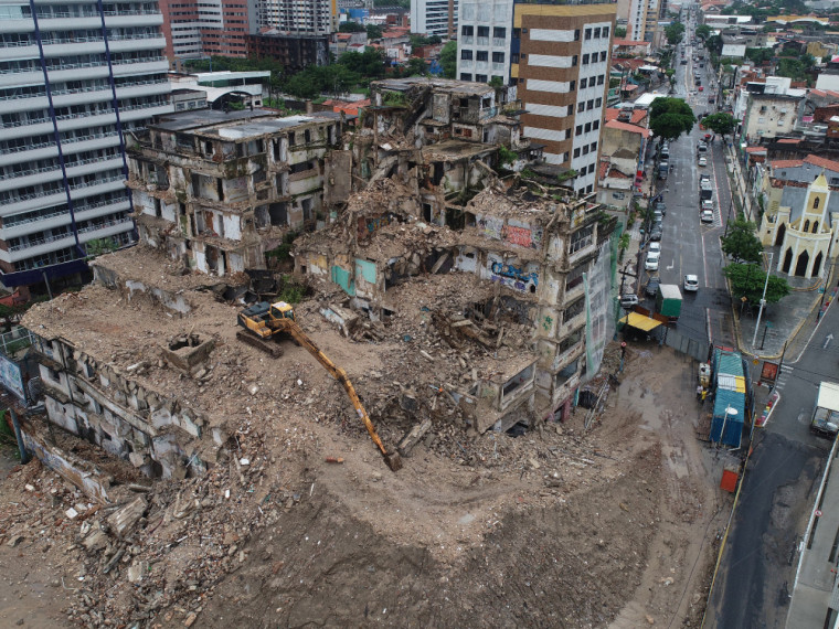 Um mês e 26 dias após o início da demolição do Edifício São Pedro, a estrutura localizada no bairro Praia de Iracema, em Fortaleza, já difere da memória histórica. As obras estão 40% concluídas e seguem para fase de desmonte do prédio, segundo a Secretaria Municipal da Infraestrutura (Seinf).