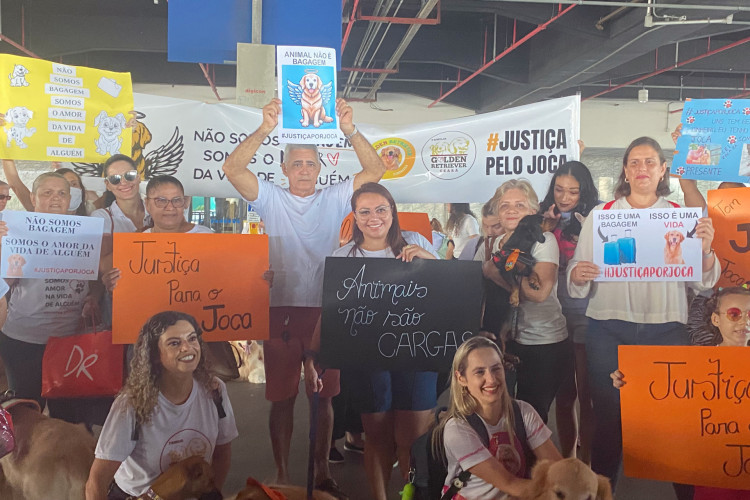 Os manifestantes se reuniram no Aeroporto Internacional Pinto Martins, local em que Joca foi enviado por engano, em protesto às condições de transporte dos pets
