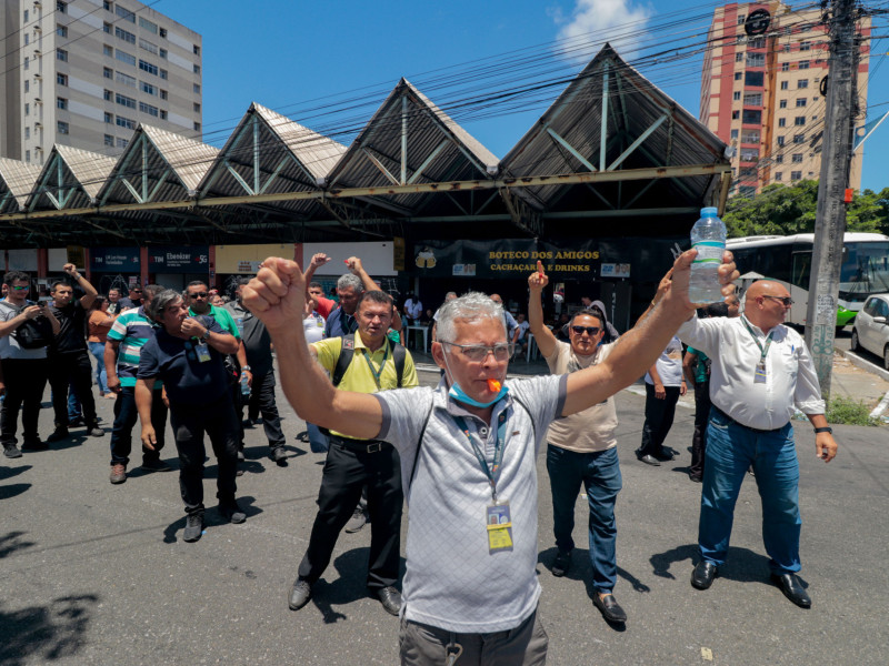 Os trabalhadores da empresa São Benedito protestaram, na manhã desta sexta-feira, 1º, contra a nova empresa que fará operações das linhas do Litoral Leste