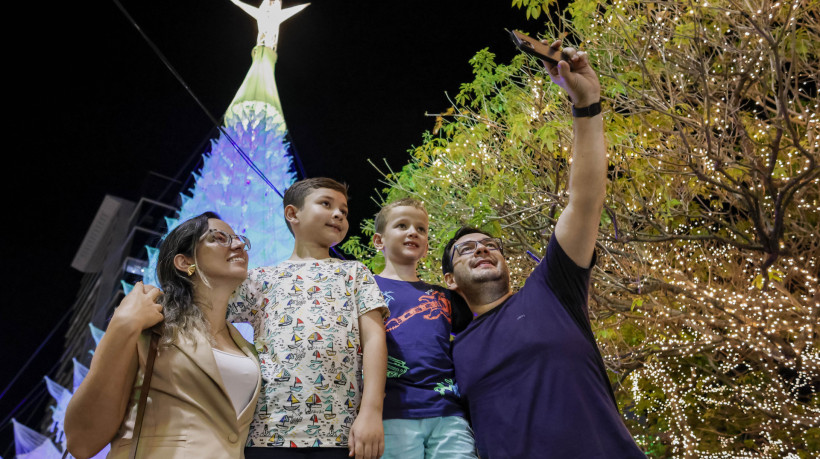 Entre moradores, visitantes e turistas, não faltou quem se admirasse com a decoração e sacasse o celular para fazer registros. A árvore, que tem 35 metros de altura, conta com oito painéis ao redor que exploram o mote “Se o Menino Jesus aqui fosse nascido”.