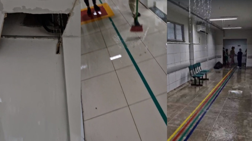Vídeos feitos por servidores e pacientes mostram água escorrendo pelo teto, especialmente por brechas nas fiações elétricas. Nos registros, também é possível ver profissionais de serviços gerais tentando arrastar a água, sem sucesso, com rodos e vassouras.