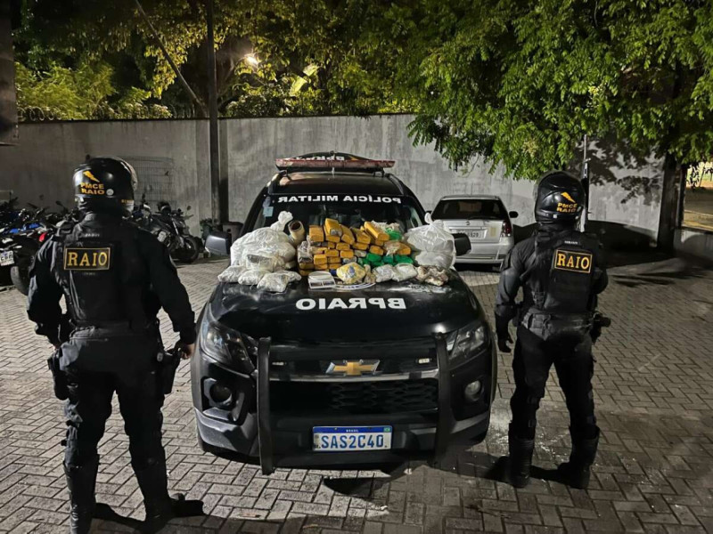 Foram encontrados 38 kg de maconha, 24,1 kg de pasta base de cocaína e 1,8 kg de uma substância ainda não identificada, além de uma balança de precisão e dois rolos de plástico filme.