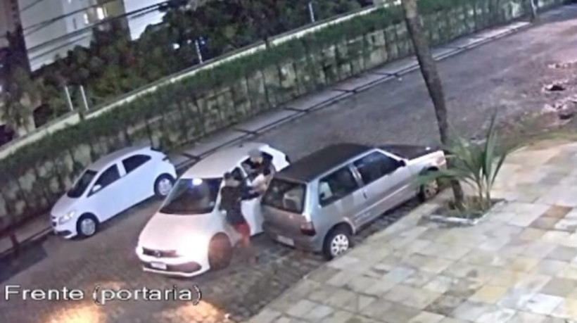 Imagens de uma câmera de segurança registraram o momento em que o veículo chega e dois suspeitos aboradam o motorista. O condutor ainda tenta sair com o carro para evitar o assalto, mas os suspeitos começam a tirar os pertences da vítima pela janela do veículo.